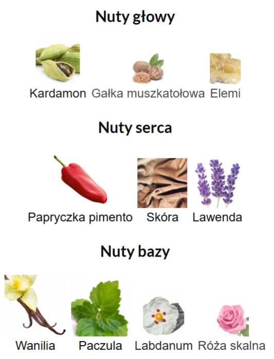W sercu perfum pojawia się wyraźny akord skóry, uzupełniony o pimento i prowansalską lawendę, co tworzy bogatą, aromatyczną strukturę o lekko zmysłowym wyrazie. Całość osadzona jest na bazie z paczuli, wanilii i labdanum, które odpowiadają za kremowe, żywiczne wykończenie i bardzo dobrą trwałość.