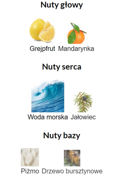 Pierwsze wrażenie przynosi soczystą mieszankę mandarynki i grejpfruta, która natychmiast orzeźwia i pobudza zmysły. W sercu zapachu wyczuwalne są morskie akordy oraz jałowiec, które wzmacniają uczucie chłodu i świeżości, jednocześnie nadając całości lekko pikantnego charakteru. Kompozycję dopełnia miękka baza złożona z piżma i drzewa bursztynowego, która wprowadza ciepło i utrwala zapach na skórze.