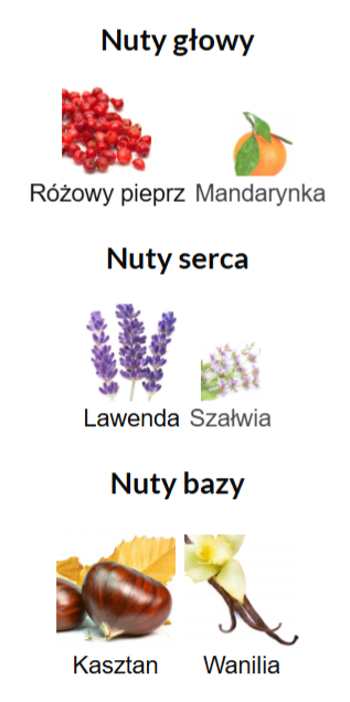 Otwarcie zachwyca energetycznym duetem mandarynki i różowego pieprzu, które wnoszą świeżość z lekkim, korzennym akcentem. W sercu pojawia się aromatyczne połączenie lawendy i szałwii, dodające całości elegancji i nowoczesnego wyrazu. Baza bazuje na kremowej wanilii, skórzanych niuansach i słodkim akcencie kasztana, które tworzą ciepłe, otulające zakończenie.