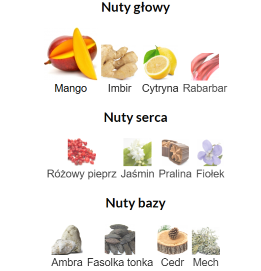 Już w otwarciu uderza tropikalna świeżość soczystego mango, wsparta ostrzejszymi nutami imbiru, cytryny i rabarbaru. Serce zapachu rozwija się poprzez połączenie różowego pieprzu, fiołka, jaśminu i słodkiej praliny, które wprowadzają zmysłową i nieco gourmandową głębię. Całość opiera się na ciepłej, drzewnej bazie z tonką, ambrą, cedrem i akordem mchu, nadając zapachowi stabilność i elegancję.