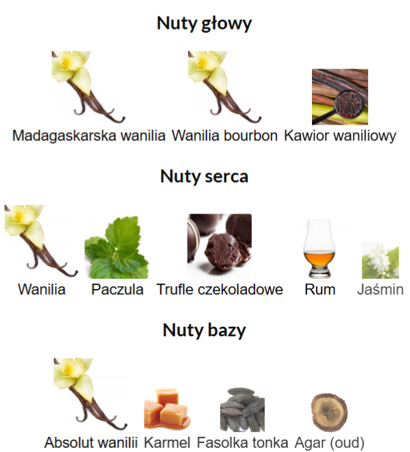 W sercu zapachu pojawiają się gourmandowe niuanse czekoladowego trufla i rumu, zestawione z paczulą i jaśminem. To połączenie sprawia, że kompozycja nabiera zmysłowości i kulinarnego, apetycznego wymiaru. Baza bazuje na absolutnej wanilii, karmelu, fasolce tonka i delikatnym oudzie, które nadają zapachowi miękkie, aksamitne i długotrwałe zakończenie.