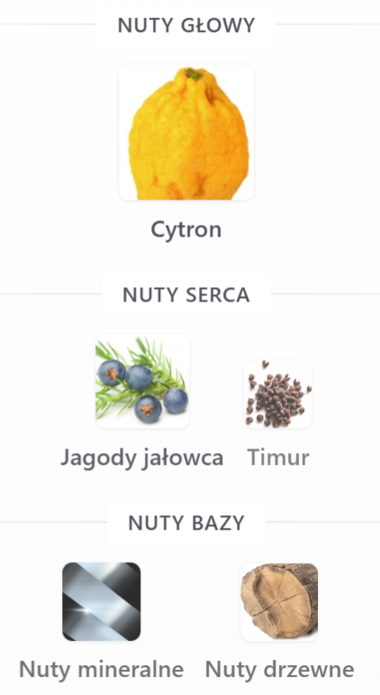 Kompozycja otwiera się wyraźną nutą cytronu, która daje jasne, orzeźwiające i bardzo naturalne pierwsze wrażenie. W sercu pojawiają się jagody jałowca i pieprz timut, nadając zapachowi charakterystycznej, lekko pikantnej świeżości z nutą „lodowego” efektu. Całość oparta jest na nutach drzewnych i mineralnych, które budują suchą, elegancką i bardzo nowoczesną bazę.