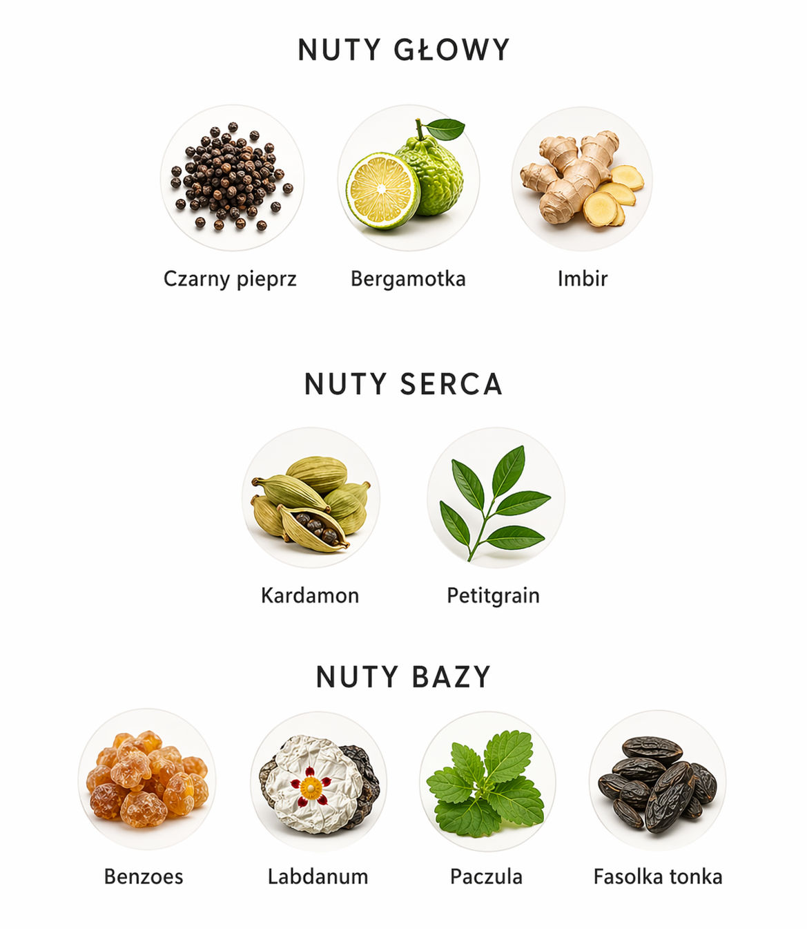 Otwiera się pikantnie — czarny pieprz i imbir przeplatają się z cytrusową bergamotką. W sercu pojawia się aromatyczny kardamon i lekko gorzki petitgrain, a całość zamyka kremowa baza z tonkowcem, żywiczną benzoiną i dymną paczulą.