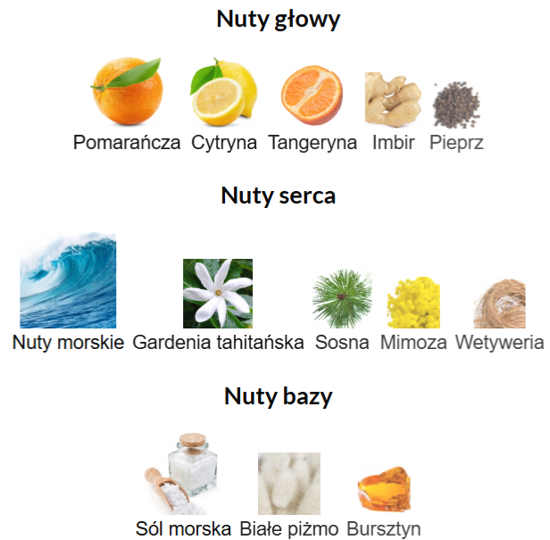 W sercu zapachu wyczuwalne są morskie niuanse, przywodzące na myśl delikatną bryzę znad wybrzeża, harmonijnie połączone z kwiatowymi akcentami gardenii tahitańskiej i mimozy. Całość dopełnia obecność nut drzewnych, takich jak sosna i wetyweria, które dodają naturalnej głębi i struktury. Baza zbudowana jest z soli morskiej, ambroksanu i białego piżma, co sprawia, że kompozycja długo utrzymuje się na skórze i ma eleganckie, czyste wybrzmienie.