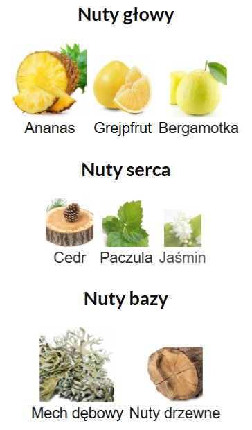 Otwarcie przynosi energetyczne akordy bergamotki, ananasa i grejpfruta, tworząc soczyste i promienne wrażenie. W sercu zapachu rozkwita eleganckie połączenie jaśminu, paczuli i cedru, dodające mu wyrafinowanej lekkości. Baza oparta na mchu dębowym, clearwood i suchych nutach drzewnych zapewnia charakterystyczną głębię oraz imponującą trwałość.