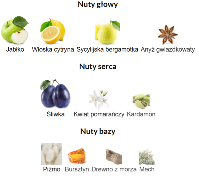 Już na początku ujawniają się wyraziste nuty jabłka, cytryny z Włoch, bergamotki z Sycylii oraz anyżu gwiazdkowego, nadając zapachowi cytrusowy, rześki charakter z aromatycznym akcentem. W sercu rozkwita słodycz śliwki i kwiatu pomarańczy, subtelnie doprawiona korzennym kardamonem, co nadaje kompozycji przyjemnej głębi. Całość dopełnia drzewna baza z nutami piżma, bursztynu, mchu i drewna dryfującego, które nadają zapachowi elegancji i trwałości.